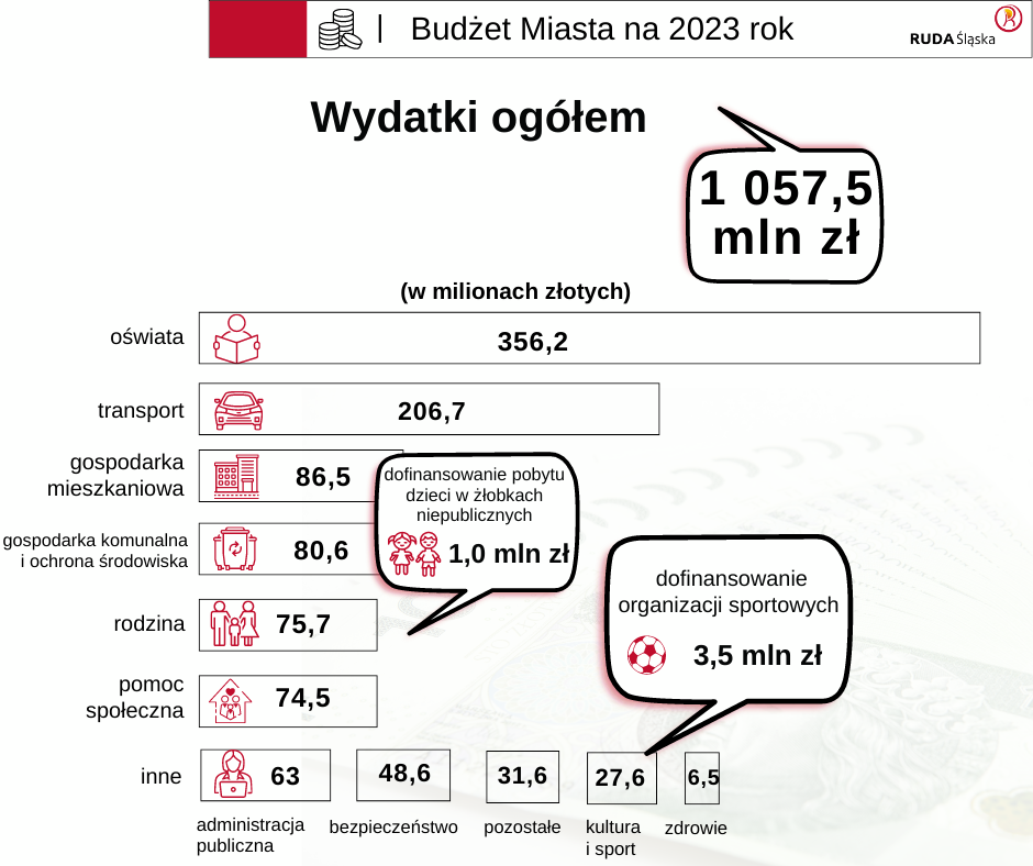 Opublikowany został projekt budżetu Rudy Śląskiej na 2023 rok. Zaplanowane wydatki mają wynieść blisko 1 mld i 51 mln zł, natomiast dochody prawie 935,8 mln zł.