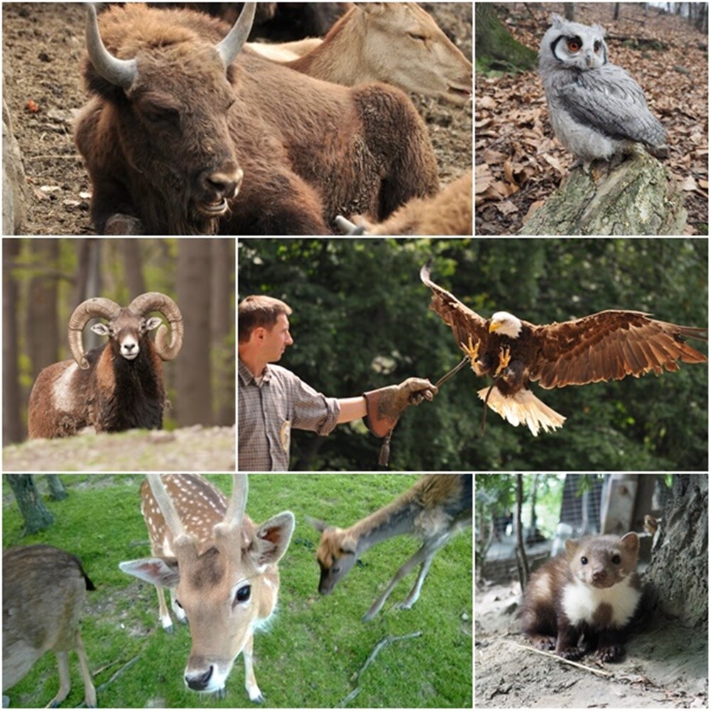 Jedną z ciekawszych atrakcji parku są muflony i daniele, które swobodnie przemieszczają się wśród zwiedzających, i które to można karmić z ręki. W zagrodach zobaczymy: żubry, jelenie szlachetne, sarny, dziki, żbiki czy jenoty. Bez sprzecznie największymi atrakcjami parku są sokolarnia i sowiarnia, gdzie o wyznaczonych porach wykwalifikowani sokolnicy prezentują ptaki drapieżne i sowy podczas ich lotów.