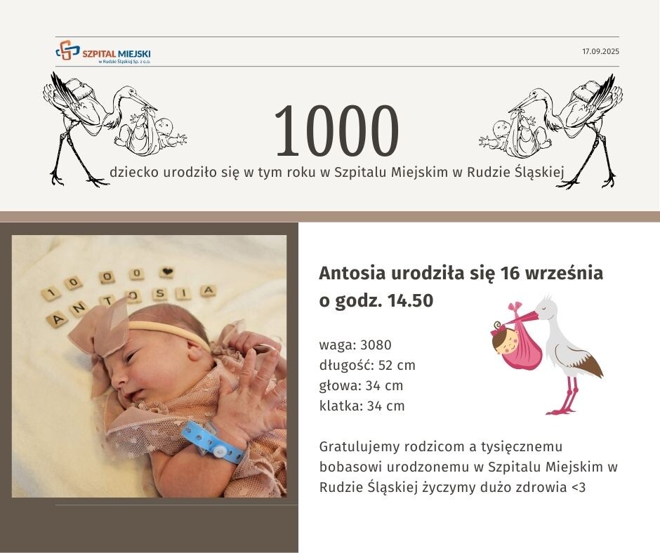 Szpital Miejski w Rudzie Śląskiej świętuje narodziny tysiącznego dziecka w 2025 roku! 16 września na świat przyszła Antosia, ważąca 3080 gramów i mierząca 52 cm. To symboliczne wydarzenie podkreśla jakość i profesjonalizm opieki porodowej, jaką szpital oferuje przyszłym mamom.