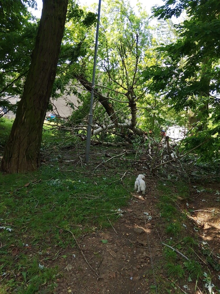 - ul. 1 Maja – powalone drzewo przed przejazdem kolejowym, w kierunku Halemby.