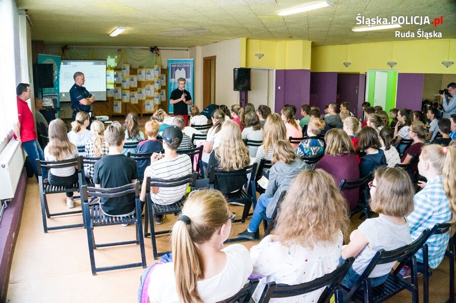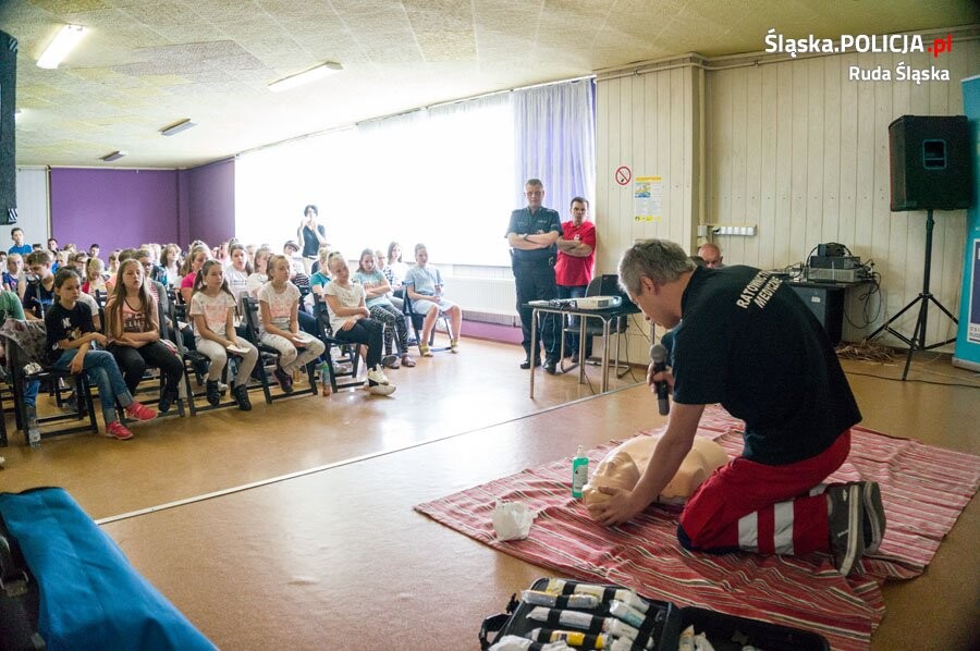 Rudzki dzielnicowy przedstawił dzieciom zasady jakie obowiązują podczas letniego wypoczynku, górskich wycieczek i kąpieli w zbiornikach wodnych. Zebrani uczniowie dowiedzieli się jakie są najważniejsze zasady bezpieczeństwa w trakcie przebywania na podwórku i jak mają się zachować gdy zostaną nagabywani przez obcych. Każdy z uczestników otrzymał ulotkę wydaną specjalnie na to spotkanie a zawierającą podstawowe zasady jakimi należy się kierować aby być bezpiecznym. Dużym zainteresowaniem cieszył się także pokaz podstawowych czynności ratunkowych zaprezentowany przez zawodowego ratownika medycznego. Liczymy, że dzięki tego typu spotkaniom z uczniami podstawówek, będą oni wiedzieć jak unikać zagrożeń podczas wakacyjnych wyjazdów.