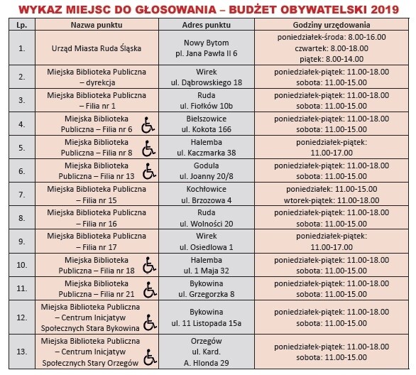 Rudzianie, którzy wolą zagłosować w tradycyjny sposób, będą mogli to zrobić w kilkunastu punktach na terenie miasta, zlokalizowanych w Urzędzie Miasta oraz filiach Miejskiej Biblioteki Publicznej. Wypełnioną kartę do głosowania należy wrzucić do urny po uprzednim okazaniu dokumentu potwierdzającego tożsamość i dokonaniu wpisu na liście głosujących. Każdy głosujący może wskazać jedno zadanie ogólnomiejskie i jedno lokalne. Listę zadań z dokładną lokalizacją i opisami oraz wykaz miejsc do głosowania można znaleźć na stronie rudaslaska.budzet-obywatelski.org. Wyniki zostaną ogłoszone do 28 września br.