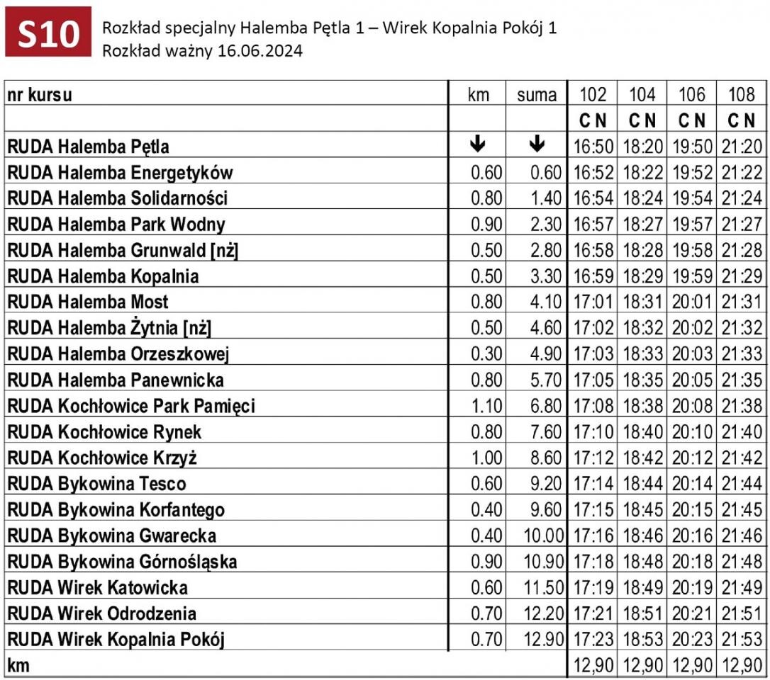 Linia S10 w kierunku Halemby kursować będzie po trasie: Wirek Kopalnia Pokój - Wirek Odrodzenia - Wirek Katowicka - Bykowina Górnośląska - Bykowina Gwarecka - Bykowina Korfantego - Bykowina Tesco - Kochłowice Krzyż - Kochłowice Kościół - Kochłowice Park Pamięci - Halemba Panewnicka - Halemba Orzeszkowej - Halemba Żytnia [nż] - Halemba Most - Halemba Kopalnia - Halemba Grunwald [nż] - Halemba Park Wodny - Halemba Solidarności - Halemba Energetyków - Halemba Pętla.
