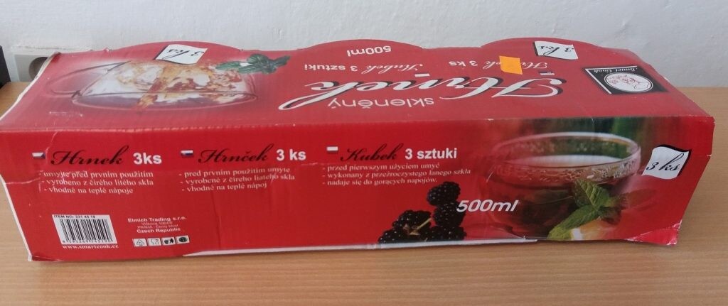 - Na opakowaniu zestawu 3 szklanych kubków wymieniono podmiot odpowiedzialny za produkt: Elmich Trading s.r.o., Vlčkova 1064/6, PRAHA – Černý Most, Czech Republic.