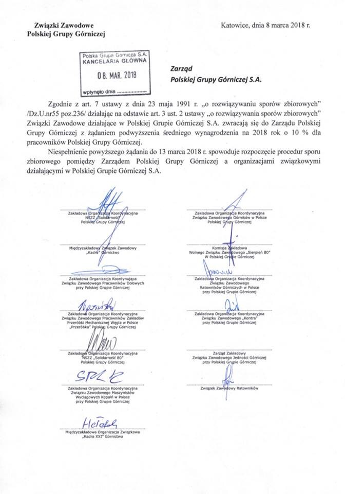 Z dniem 8 marca reprezentanci 12 związków zawodowych działających przy Polskiej Grupie Górniczej podpisały żądanie (fot. poniżej), w którym wskazują 10% podwyżki średniego wynagrodzenia dla pracowników PGG. Niespełnienie postulatu do dnia 13 marca miało skutkować rozpoczęciem procedur sporu zbiorowego. Tak też się stało. Zarząd spółki nie pozostał jednak obojętny na kroki związkowców. Odpowiedział zaproszeniem do rozmów i otwartością na działania. Spotkanie obu stron ma się odbyć 26 marca 2018.
