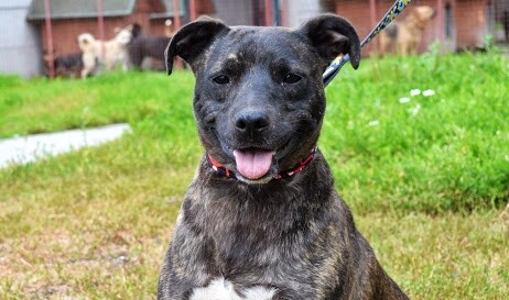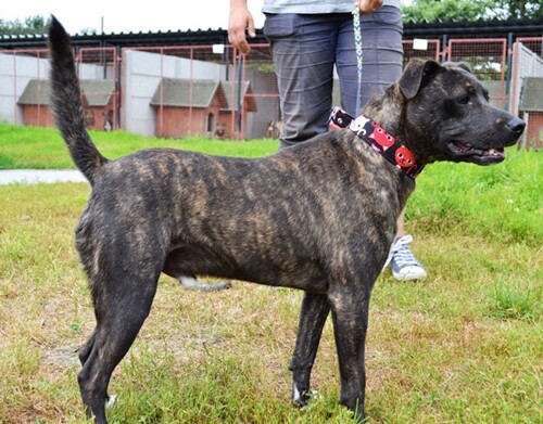Kenzo jest średnim ok. 2,5 letnim psiakiem. Przypomina nieco mieszańca amstaffa z pięknym pręgowanym umaszczeniem.