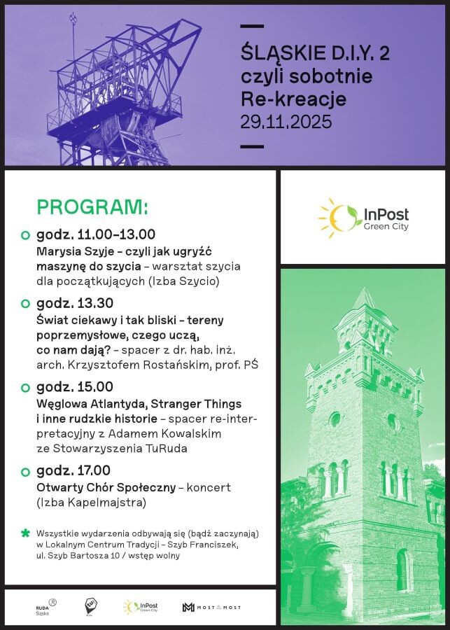 Śląskie D.I.Y. 2, czyli sobotnie Re-kreacje, organizowane jest pod patronatem InPost Green City, miasta Ruda Śląska oraz stowarzyszenia TURuda. Organizatorzy przewidzieli niemal cały dzień pełen atrakcji - będą warsztaty, spacery i koncert! Wszystkie wydarzenia odbywają się (lub zaczynają!) w Lokalnym Centrum Tradycji w Szybie Franciszek. Ze szczegółowym programem zapoznacie się poniżej!