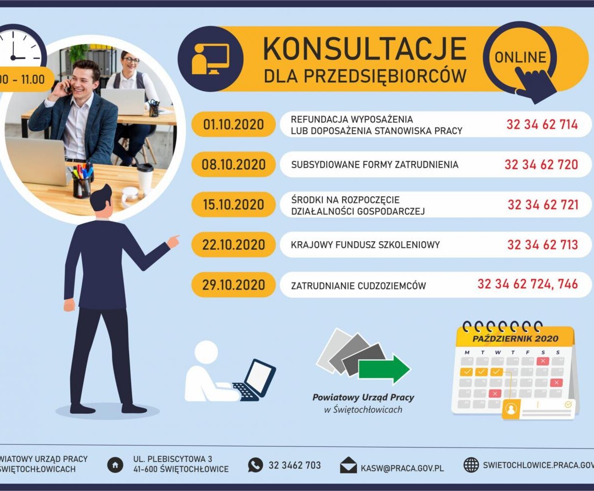 - 1 października 2020 r. – godz. 9.00-11.00 – telefon kontaktowy: 32 34 62 714 – Refundacja wyposażenia lub doposażenia stanowiska pracy (ogólne informacje dotyczące formy wsparcia, tryb i zasady składania wniosków, realizacja i monitoring zawartych umów),