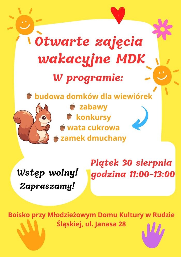 Ty i twoja pociecha nie macie jeszcze planów na najbliższy piątek? Młodzieżowy Dom Kultury zaprasza dzieci i młodzież z rodzicami na otwarte zajęcia wakacyjne, które odbędą się na boisku przy MDK-u w godzinach od 11:00 do 13:00. Oprócz budowy domków dla wiewiórek przewidziano również gry, zabawy sportowe, zajęcia plastyczne, konkursy, a także zamek dmuchany i słodkości w postaci waty cukrowej!