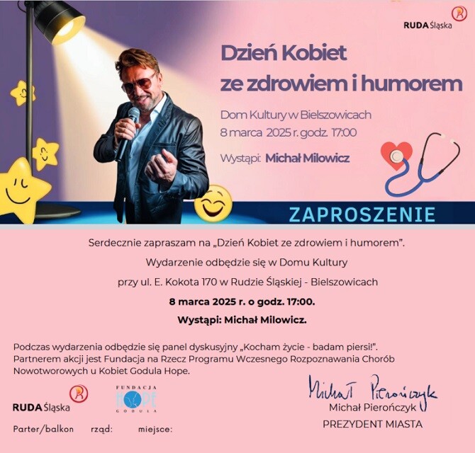 Z okazji Dnia Kobiet w Rudzie Śląskiej odbędzie się wyjątkowe wydarzenie łączące rozrywkę i edukację. 8 marca o godzinie 17:00 w Domu Kultury w Bielszowicach gościem specjalnym będzie Michał Milowicz, a w ramach spotkania zaplanowano również panel dyskusyjny „Kocham życie – badam piersi” poświęcony profilaktyce raka piersi.