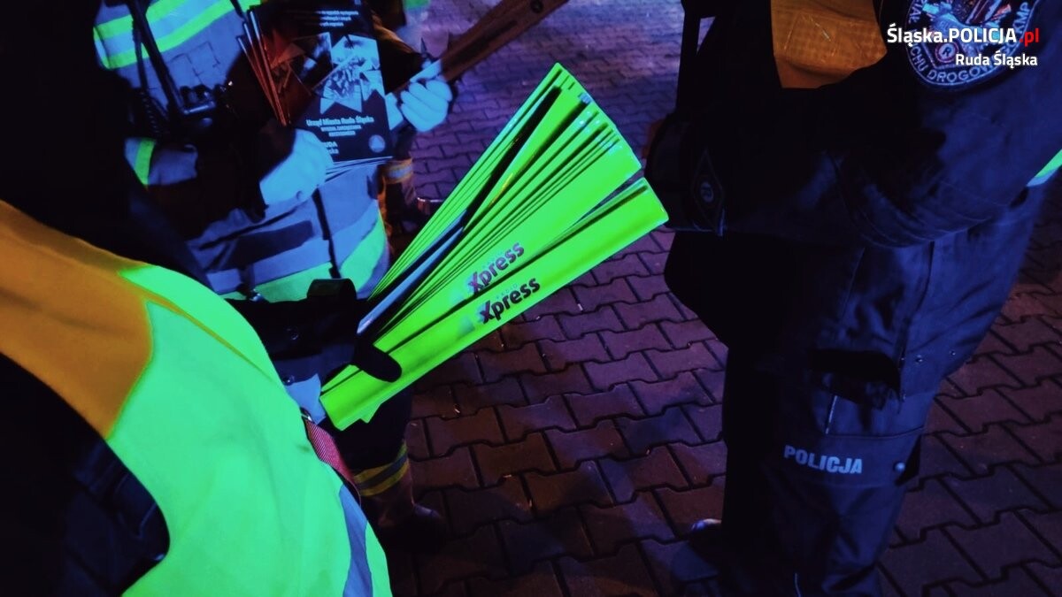 Policjanci, Strażnicy miejscy i strażacy z OSP Ruda Śląska wraz z przedstawicielami mediów spotkali się w czwartkowy wieczór, aby popularyzować noszenie odblasków przez pieszych w ramach akcji „Świeć Przykładem”. Celem działań było uświadomienie mieszkańcom, jak ważne jest być widocznym, szczególnie po zmroku. Jeżeli w okresie jesienno-zimowym pieszy ubrany jest w ciemne kolory, to kierowca zobaczy go dopiero z odległości około 15 metrów, ale już wyposażonego w element odblaskowy, może zobaczyć z odległości nawet 150 metrów! Niby niepozorny element odblaskowy, a aż dziesięciokrotnie poprawia bezpieczeństwo pieszych.