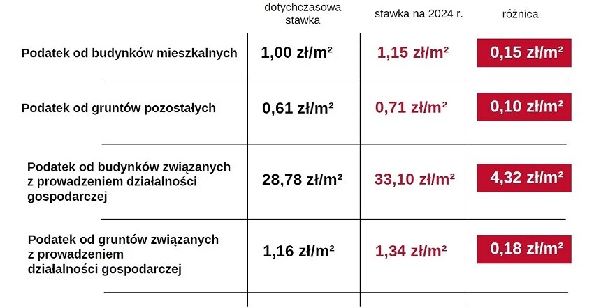 W 2024 roku stawka za 1 m² powierzchni użytkowej budynków mieszkalnych wyniesie 1,15 zł, czyli o 15 gr więcej niż obecnie. W przypadku budynków związanych z prowadzeniem działalności gospodarczej oraz budynków mieszkalnych lub ich części zajętych na prowadzenie działalności gospodarczej stawka za 1 m² będzie wyższa od obecnej o 4,32 zł i wyniesie 33,10 zł. Natomiast stawka za 1 m² powierzchni gruntów związanych z prowadzeniem działalności gospodarczej wzrośnie z 1,16 zł do 1,34 zł. Podatek od gruntów pozostałych wzrośnie z 0,61 zł do 0,71 zł za 1 m².