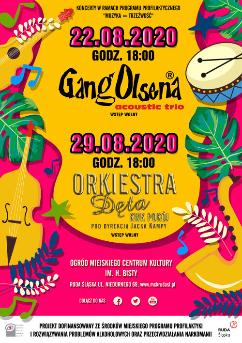 29 sierpnia 2020 (sobota) godz. 18.00 - Ogród MCK - Orkiestra Dęta KWK Pokój pod dyrekcją Jacka Kampy - koncert w ramach Programu Profilaktycznego "Muzyka = Trzeźwość".