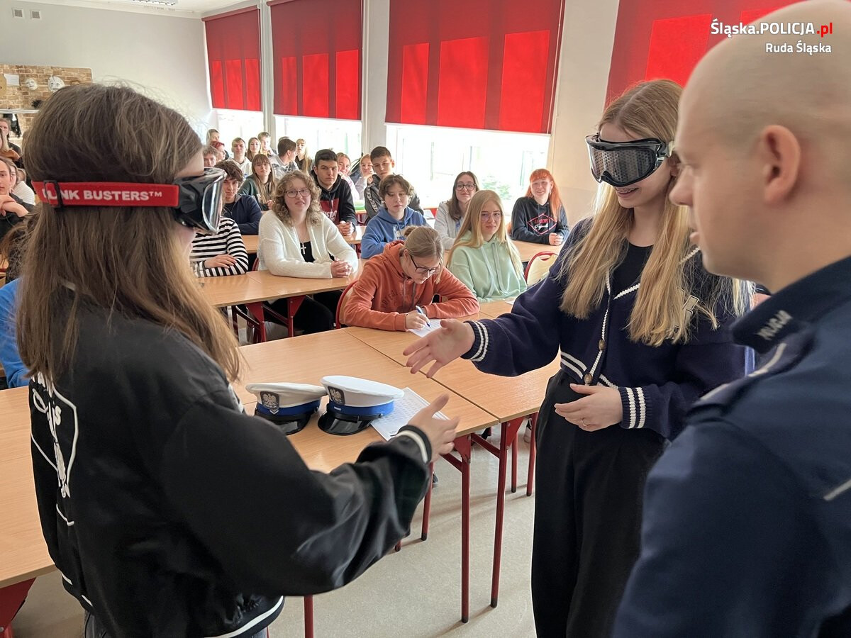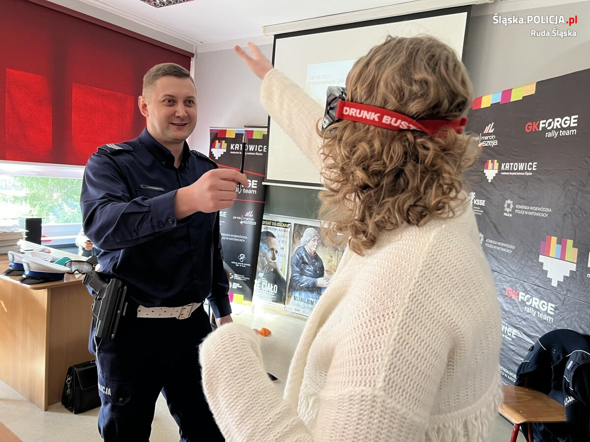 Chętni licealiści zostali zaproszeni do pokonania małego toru przeszkód w alko i narko goglach. Jak sami doświadczyli, było to dla niektórych nie lada wyzwanie. Mundurowi przedstawili uczniom kilka praktycznych wskazówek, dzięki którym młodzi ludzie w przyszłości mogą uniknąć utraty prawa jazdy oraz większych tragedii, związanych z wypadkami drogowymi.