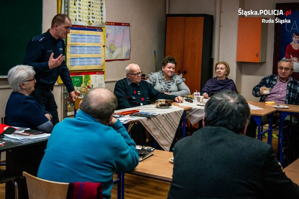 Policjanci z rudzkiego garnizonu prowadzą na terenie miasta spotkania profilaktyczne skierowane do najróżniejszych grup społecznych. Mundurowi bardzo często odwiedzają rudzkie placówki oświatowe, rozmawiają z dziećmi i młodzieżą o bezpieczeństwie, problematyce uzależnień, cyberzagrożeniach, odpowiedzialności prawnej nieletnich i karnej dorosłych, właściwym kibicowaniu i o wielu innych problemach. Policjanci systematycznie spotykają się również z rudzkimi seniorami. Wtorkowe spotkanie odbyło się na Uniwersytecie III Wieku przy ulicy Tołstoja. Policyjny profilaktyk rozmawiał ze słuchaczami o różnego rodzaju zagrożeniach bezpieczeństwa i oszustwach. Przedstawił sposoby działania przestępców starających się oszukiwać metodą „na wnuczka” i „na policjanta” oraz inne, którymi posługują się przestępcy, aby wyłudzić od starszych osób oszczędności stanowiące nieraz dorobek całego ich życia.