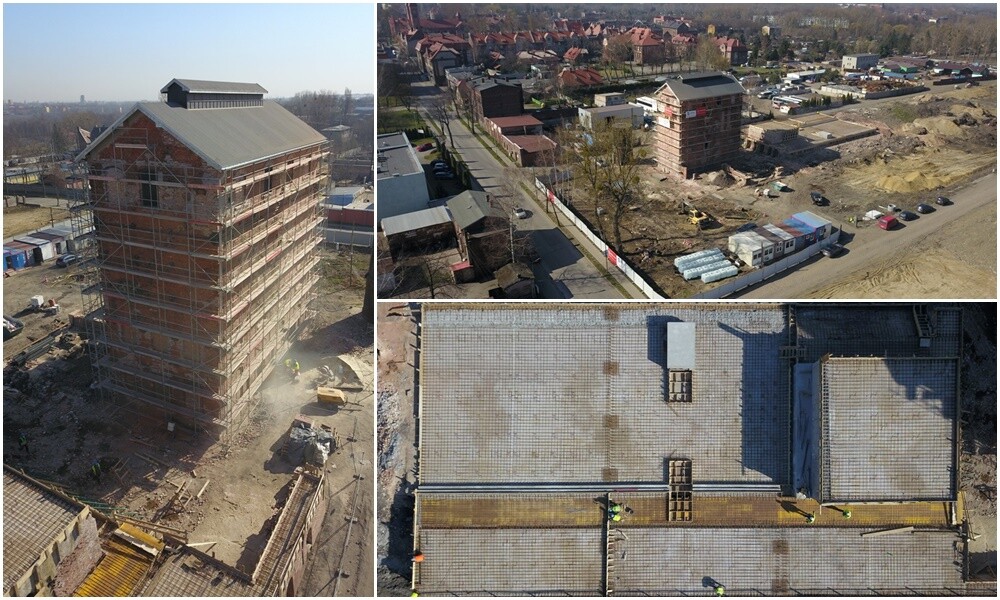 - Zagrożenie spowodowane epidemią koronawirusa wymusiło na nas i na zespole projektowo-wykonawczym nowe sposoby działania. Żeby nie zwalniać tempa prac odbywamy zdalne narady, a do oceny zaawansowania robót wykorzystujemy drona. Pomimo utrudnień proces inwestycyjny przebiega jednak bez większych zakłóceń, a jego zaawansowanie widać gołym okiem - ustabilizowana konstrukcyjnie została już wieża węglowa, odtworzony jest dach obiektu, a także oczyszczono i pomalowano zbiornik smoły. Remontowana jest również bateria koksownicza, na której powstanie taras widokowy – tłumaczy prezydent Dziedzic.