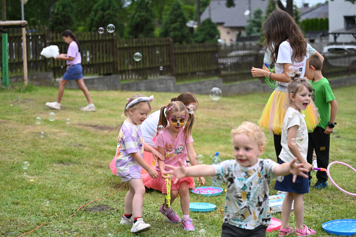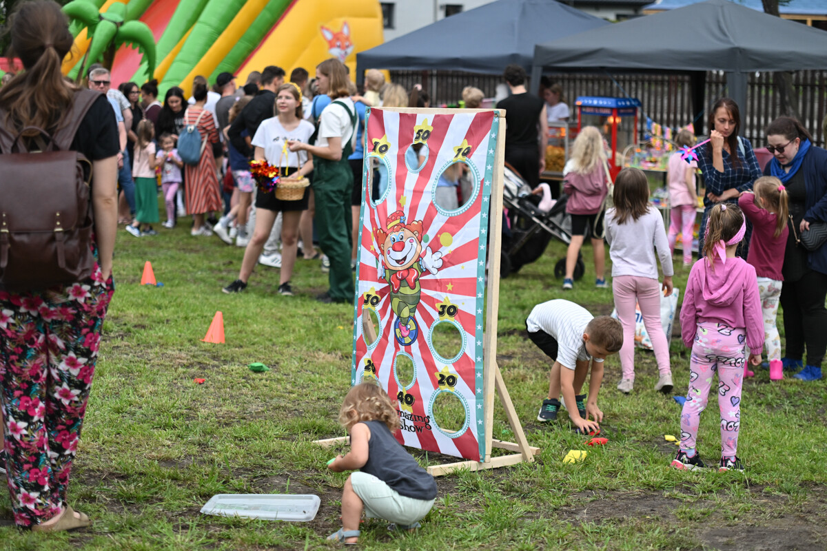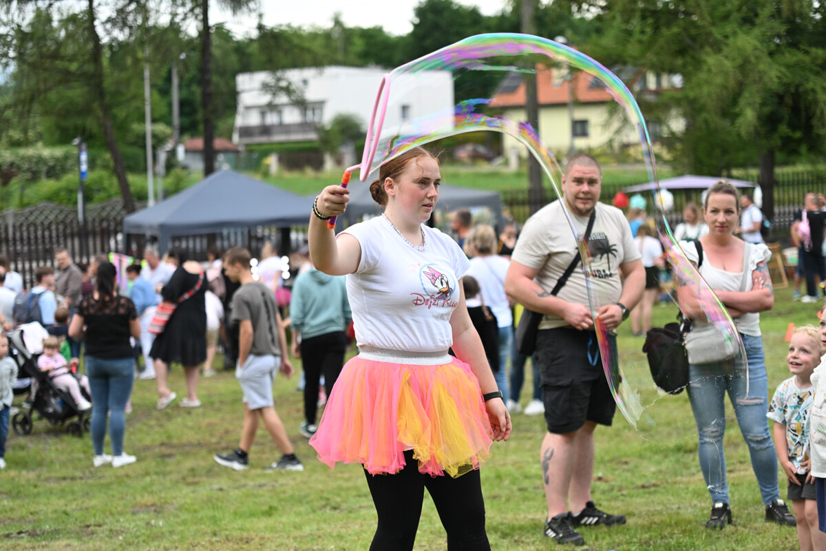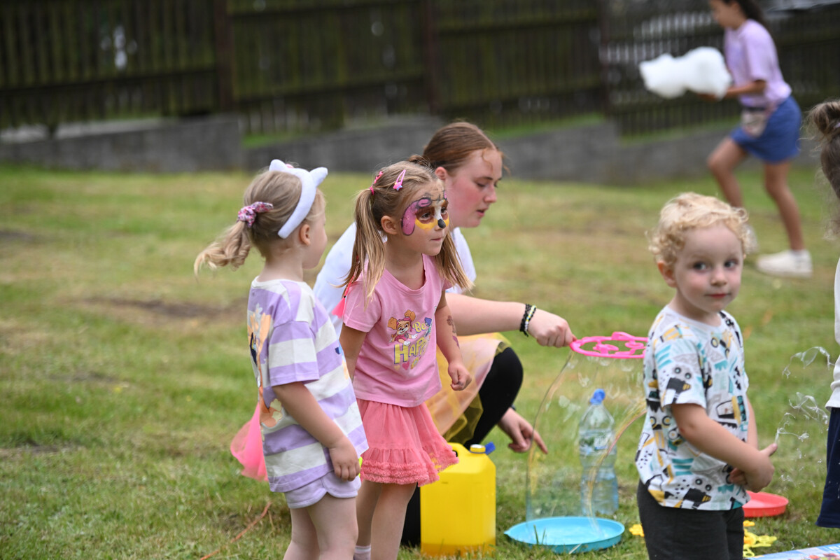 Na najmłodszych czekało mnóstwo atrakcji – od klasycznych dmuchanych zjeżdżalni, przez malowanie twarzy, strzelnicę, kącik muzyczny, po zawody Hobby Horse i spotkanie z... dinozaurem. Nie zabrakło też warsztatów z koralików, łowienia rybek, malowania odlewów, wożenia taczką i oczywiście – bańek mydlanych!