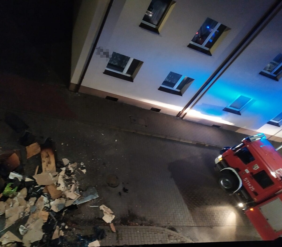 Po przyjeździe na miejsce zdarzenia okazało się, że doszło do pożaru w mieszkaniu na II piętrze. Kierujący działaniami ratowniczo - gaśniczymi otrzymał informację, że 8 lokatorów samodzielnie opuściło swoje mieszkania, a jedną osobę ewakuowała Policja. Działania strażaków polegały na ugaszeniu palących się materiałów z równoczesnym oddymieniem miejsca pożaru i klatki schodowej. W czasie działań udzielono pomocy medycznej jednemu z lokatorów, który wcześniej był ewakuowany ze swojego lokalu.