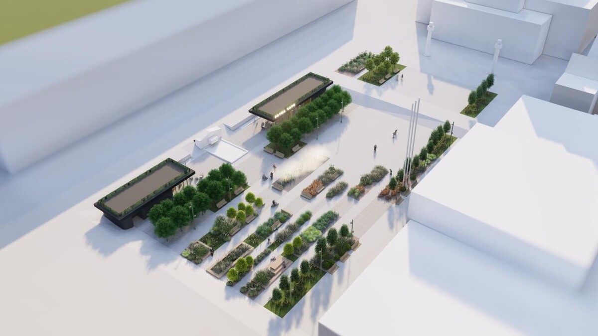 Równolegle do pawilonów przebiegać będzie główny szpaler drzew, z siedziskami i trawnikami pomiędzy nimi. W centralnej części rynku znajdować się będzie plac z okresową retencją wody, gdzie latem czynne będą kurtyny wodne.