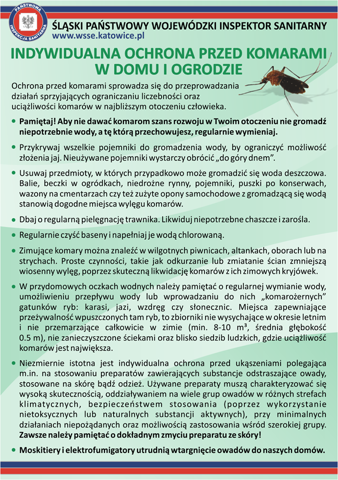 Mimo tego, obecnie nie ma w Polsce ryzyka zakażenia się żadną groźną chorobą zakaźną przenoszoną przez komary regularnie występujące na naszym terytorium, nawet jeśli ich ilość będzie zwielokrotniona w warunkach np. podtopień.