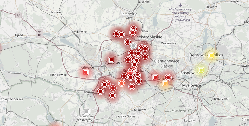 - Bielszowice – Dom Kultury, ul. Kokota - jakość powietrza zła - PM10 164,57 μg/m³, PM2,5 120,61 μg/m³