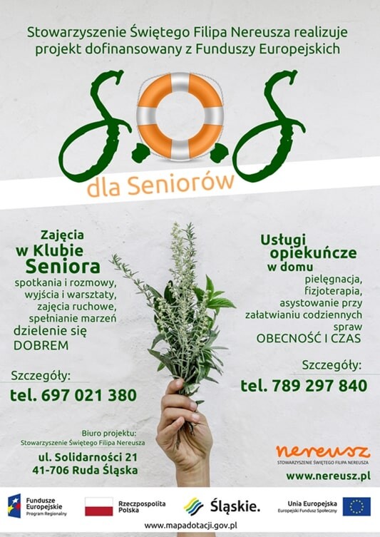Projekt "SOS dla seniorów z Rudy Śląskiej" realizowany jest w ramach Europejskiego Funduszu Społecznego. Korzystanie z wszelkich usług w ramach projektu jest bezpłatne. Szczegółowe informacje o spotkaniach Klubu Seniora oraz Kawiarence dla Seniorów można uzyskać pod numerem telefonu: 697 021 380, a o usługach opiekuńczych pod numerem telefonu 789 297 840.