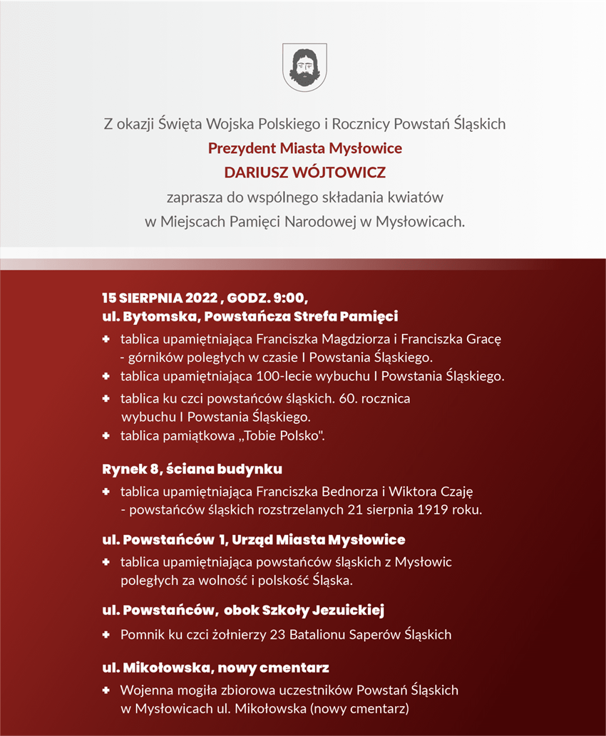 Z okazji Święta Wojska Polskiego i Rocznicy Powstań Śląskich Prezydent Miasta Mysłowice Dariusz Wójtowicz zaprasza do wspólnego składania kwiatów w Miejscach Pamięci Narodowej w Mysłowicach.