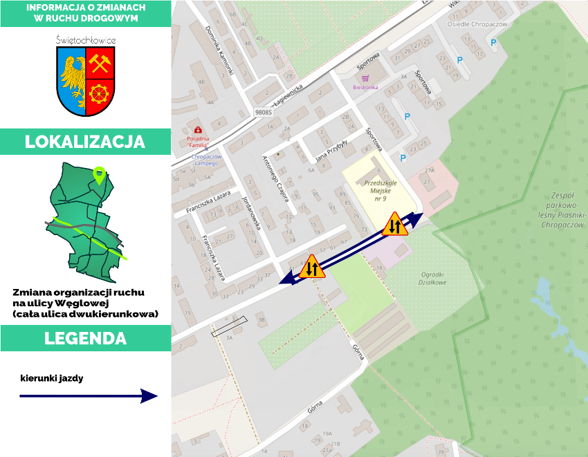 Powyższa zmiana została wprowadzona w celu zwiększenia płynności oraz bezpieczeństwa poruszania się na ulicy Węglowej przez przywrócenie ruchu dwukierunkowego.