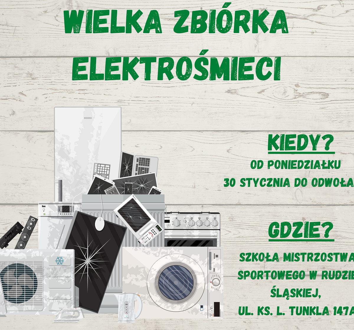 Do wzięcia udziału w zbiórce elektrośmieci szkoła chciałaby zaprosić nie tylko swoich uczniów, ale także społeczność lokalną - mieszkańców Rudy Śląskiej. Tak więc jeśli macie zużyty sprzęt elektroniczny lub elektryczny oraz zużyte baterie to prosimy o przyniesienie do Szkoły Mistrzostwa Sportowego w Rudzie Śląskiej.