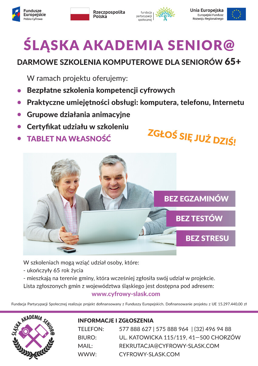 Informacji o projekcie i zapisach udziela Fundacja Partycypacji Społecznej pod adresem www.fundacja-spoleczna.pl. Więcej szczegółów także na poniższym plakacie i stronie internetowej projektu www.cyfrowy-slask.com.
