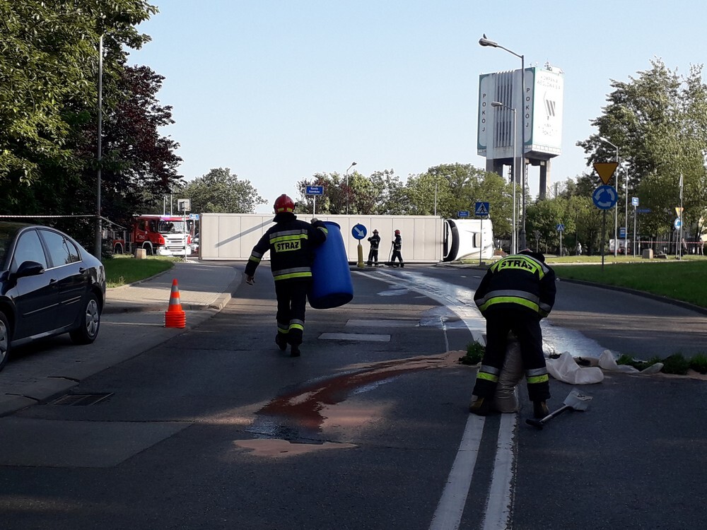 Na Rondzie Górników łączącym ulice Obrońców Westerplatte, Odrodzenia oraz Niedurnego, nieopodal kopalni Pokój, wywrócił się tir - doszło też do wycieku paliwa. Na miejscu pracuje 7 strażaków ograniczających wyciek oleju napędowego z baków uszkodzonego pojazdu. Tir przewoził tusze wieprzowe, nie ma zatem żadnego zagrożenia dla okolicznych mieszkańców.