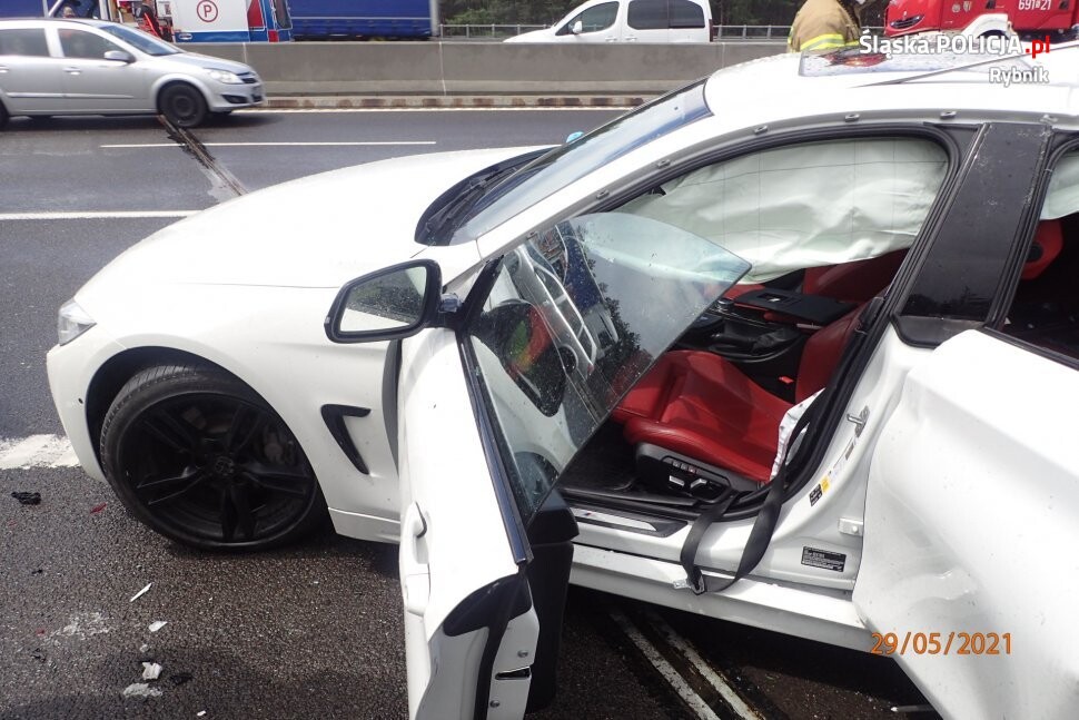 Rybniccy mundurowi z wydziału ruchu drogowego ustalili, że 20-letni mieszkaniec Sochaczewa, kierujący samochodem osobowym marki BMW, jadąc w kierunku Gliwic nie dostosował prędkości do warunków drogowych. W efekcie stracił panowanie nad pojazdem i zjechał na prawo. W wyniku manewru uderzył w samochód marki kia ceed, który stał na pasie awaryjnym oraz w bariery energochłonne.
