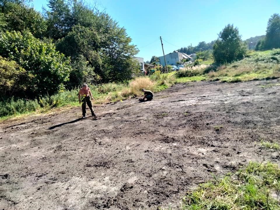 Udało się już wyrównać teren, a następnie posiać na nim trawę. Niebawem otoczenie kochłowickiego schronu powinno się zazielenić.