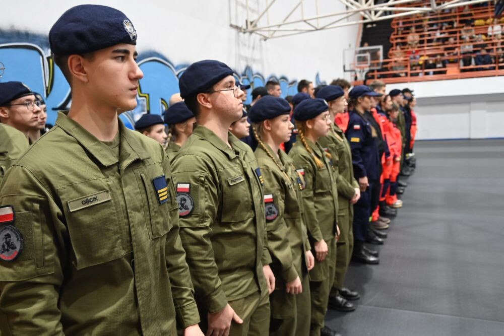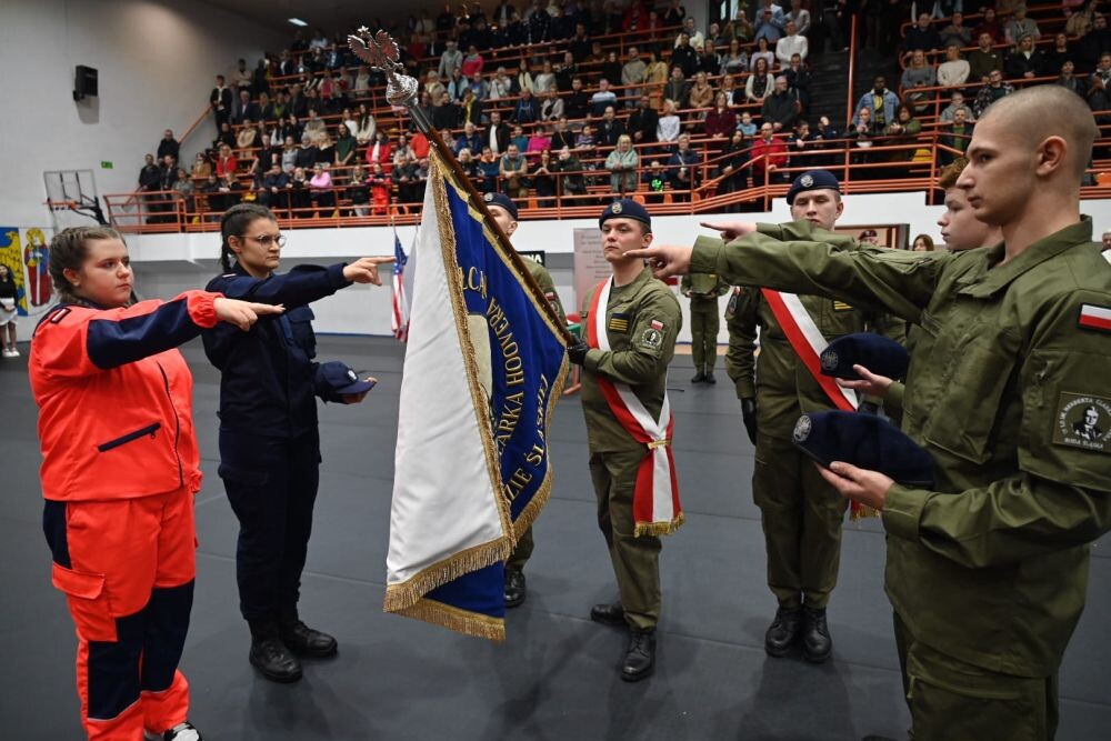 Uroczyste ślubowanie klas pierwszych o profilu wojskowym, policyjnym i ratownictwa medycznego odbyło się na hali MOSiR w Nowym Bytomiu. W sumie przysięgę złożyło 55 uczniów. Podczas uroczystości nadano również wyższe stopnie kadetom starszych klas mundurowych i przyznano wyróżnienia uczniom klas ogólnych. Wskazano także nowego Dowódcę Szkoły oraz jego zastępcę. Uczniów wspierali ich najbliżsi zasiadający na trybunach.