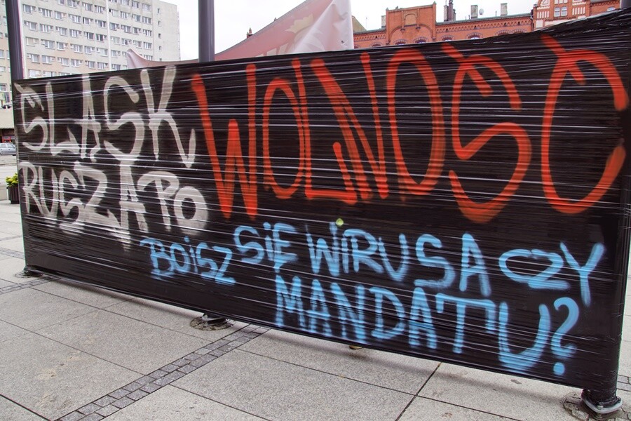 W sobotę w Rudzie Śląskiej odbył się protest przeciwko noszeniu maseczek oraz ograniczeniom związanym z pandemią koronawirusa. Uczestnicy mieli transparenty z napisami m.in. "Śląsk rusza po wolność. Boisz się wirusa, czy mandatu?", "Stop plandemii", "Śląsk to nie zaraza". Demonstrujący przeszli z placu Jana Pawła II pod kopalnie Pokój, Bielszowice i Halemba.