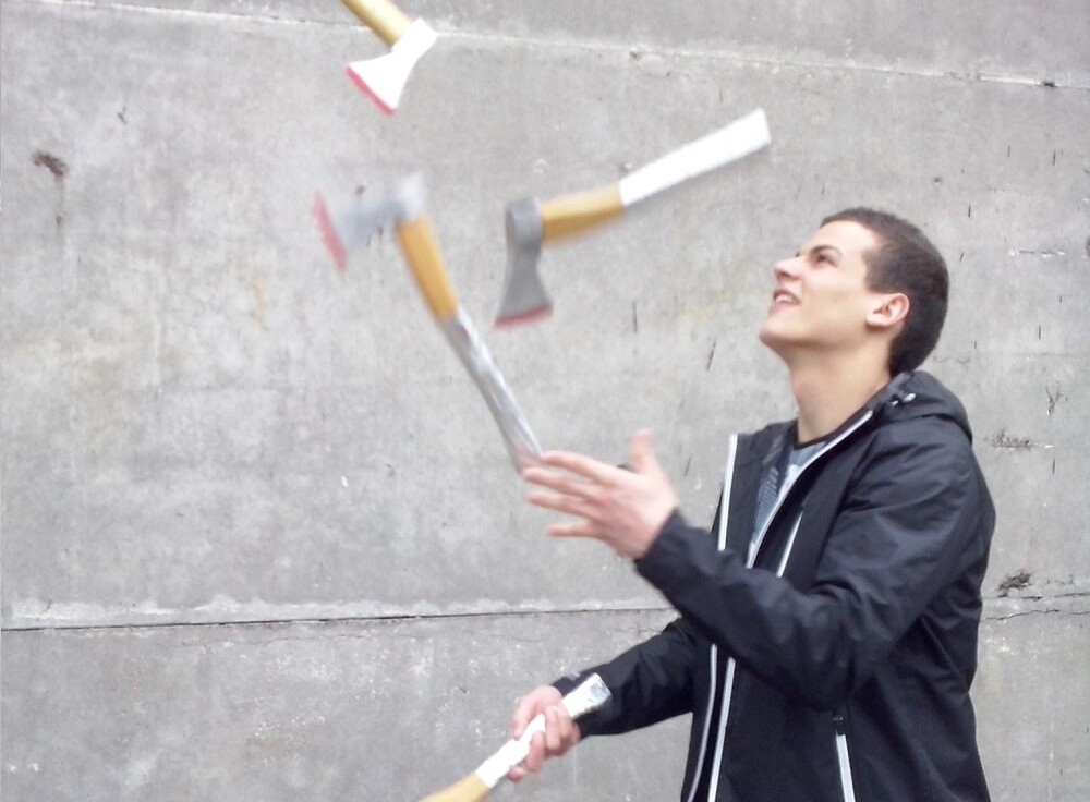 Pomysł zrodził się poprzez obserwację ojca, który potrafi żonglować trzema nożami. Chciałem mu dorównać i udało mi się. Siekierki dlatego, że dają większą dawkę emocji niż piłeczki czy maczugi, jest to już inny - niebezpieczny rodzaj żonglerki. Siekiera sama w sobie budzi różne odczucia. Podświadomie zawsze chciałem umieć coś innego, bardzo rzadko spotykanego.