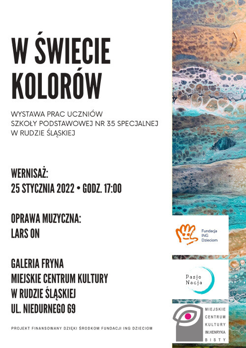 Wystawa obrazów "W świecie kolorów" jest wynikiem projektu, realizowanego pod tą samą nazwą przez uczniów Szkoły Podstawowej nr 35 w Rudzie Śląskiej. Uczniowie szkoły wzięli udział w warsztatach, podczas których malowali obrazy metodą Acrylic Pouringu inaczej nazywaną metodą malowania przez wylewanie.