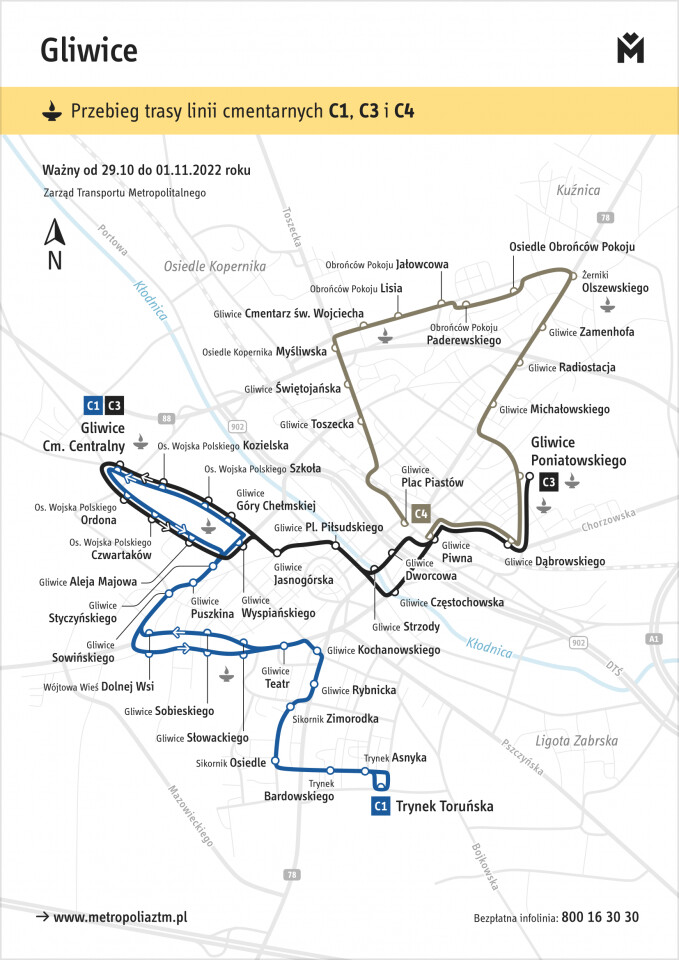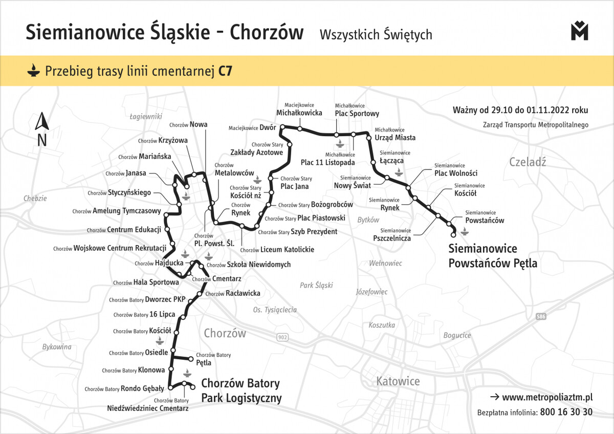 Największe modyfikacje czekają pasażerów w okresie 29 października – 2 listopada. ZTM zaplanował w tych dniach m.in. uruchamianie linii cmentarnych. 1 listopada będzie ich w sumie 16. Dzięki dodatkowym połączeniom łatwo będzie można dojechać na cmentarze w Będzinie (linia C6), Chorzowie (C2, C7, C9), Czeladzi (C11), Gliwicach (C1, C3 i C4), Katowicach (C2, C5 i C8), Knurowie (C10), Rudzie Śląskiej (C2, C9), Siemianowicach Śląskich (C7), Sosnowcu (C6) i Tychach (C12, C13, C14, C15 i C16). Dodatkowo, 1 listopada do przesiadki z aut osobowych ma zachęcać możliwość bezpłatnego korzystania z komunikacji miejskiej.