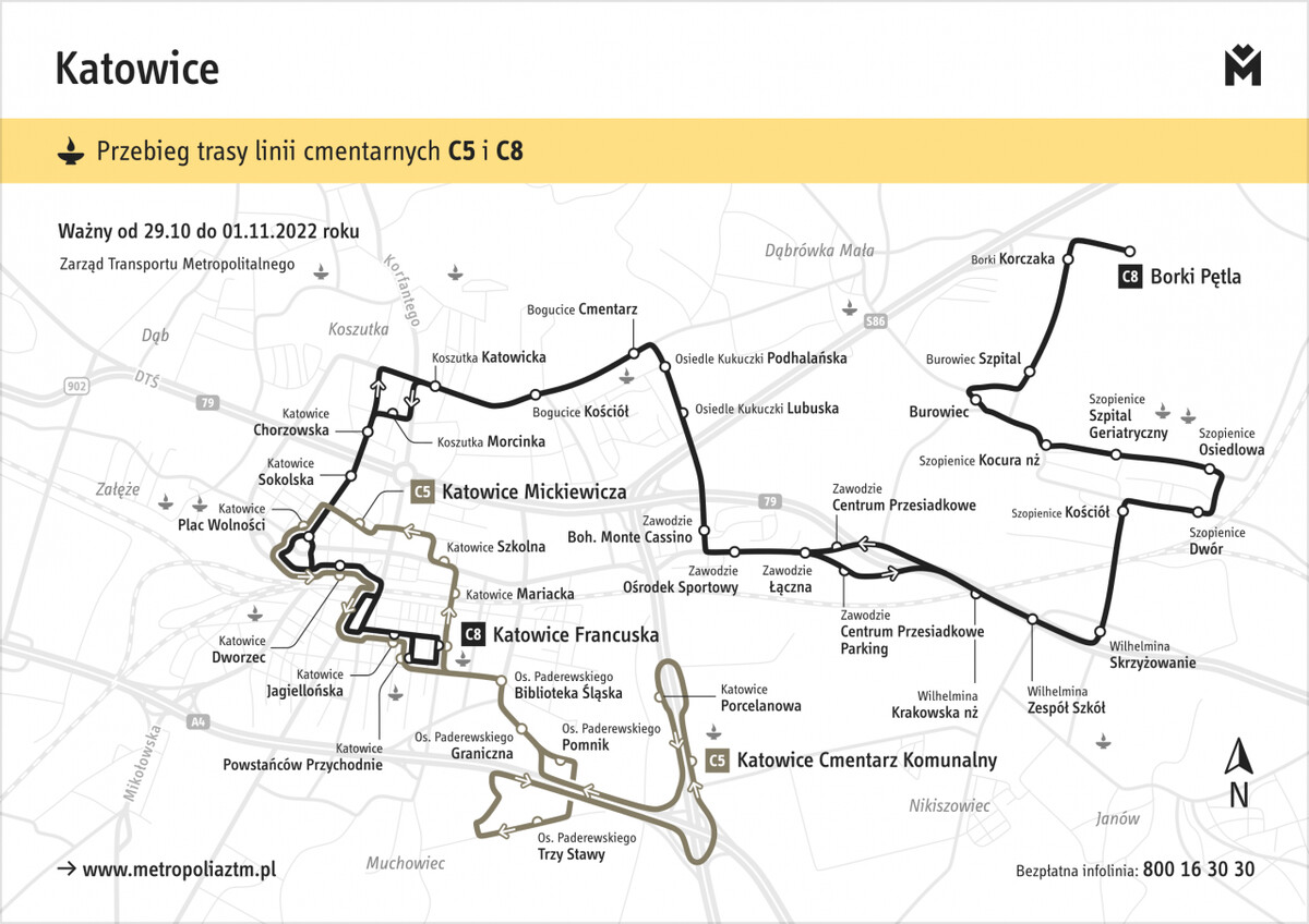 Szczegółowe informacje dotyczące zasad funkcjonowania komunikacji miejskiej w okresie 28 października – 2 listopada znajdują się na stronie internetowej ZTM w zakładce Aktualności – Komunikaty. W tym miejscu, poza opisami zmian tras poszczególnych linii, znajdują się także mapy ilustrujące trasy specjalnych linii cmentarnych. Pasażerowie, którzy we Wszystkich Świętych i wcześniej planują korzystanie z komunikacji miejskiej, w przypadku jakichkolwiek pytań mogą dzwonić na bezpłatną i czynną przez całą dobę infolinię 800 16 30 30).