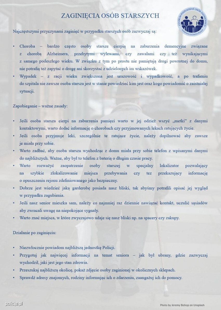 Profilaktyką dla wielu niebezpiecznych sytuacji, na które mogą być narażeni nasi seniorzy, w tym opisanych wyżej, będzie zaopatrzenie naszego bliskiego w akcesoria mogące na przykład ułatwić ustalenie miejsca jego przebywania czy przynajmniej identyfikację w przypadku odnalezienia przez Policję lub inne osoby trzecie. Można osobie starszej sprezentować zegarek z funkcją gps, zadbać aby zawsze miała przy sobie telefon komórkowy, włożyć kartkę z adresem i numerem kontaktowym (najlepiej wszyć w ubranie tak, aby nie została zgubiona lub wyrzucona). Szerzej na ten temat w załączonym do artykułu ulotce w formie zdjęcia „Jak zadbać o bezpieczeństwo seniora”.