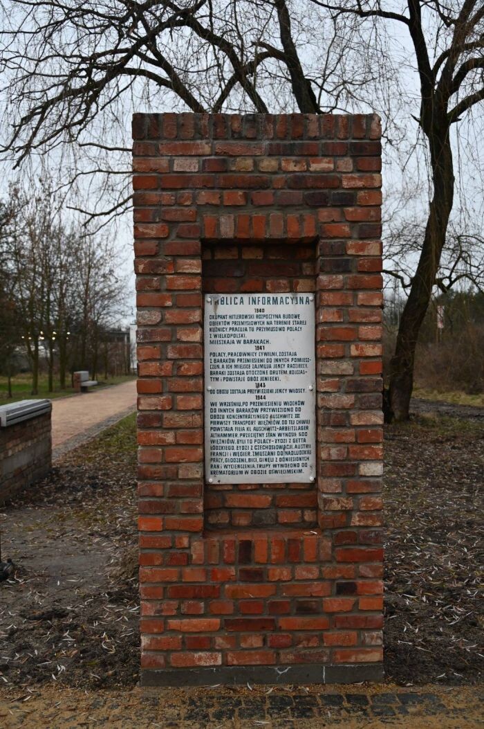 W centrum skweru znajduje się strefa pamięci – powstał nowy postument i placyk upamiętniający byłych więźniów obozu. Stworzono fragment ścianki z cegły; na niej niebawem pojawi się wizualizacja podobozu sprzed lat, a także elementy mające nawiązywać do wejścia na jego teren.