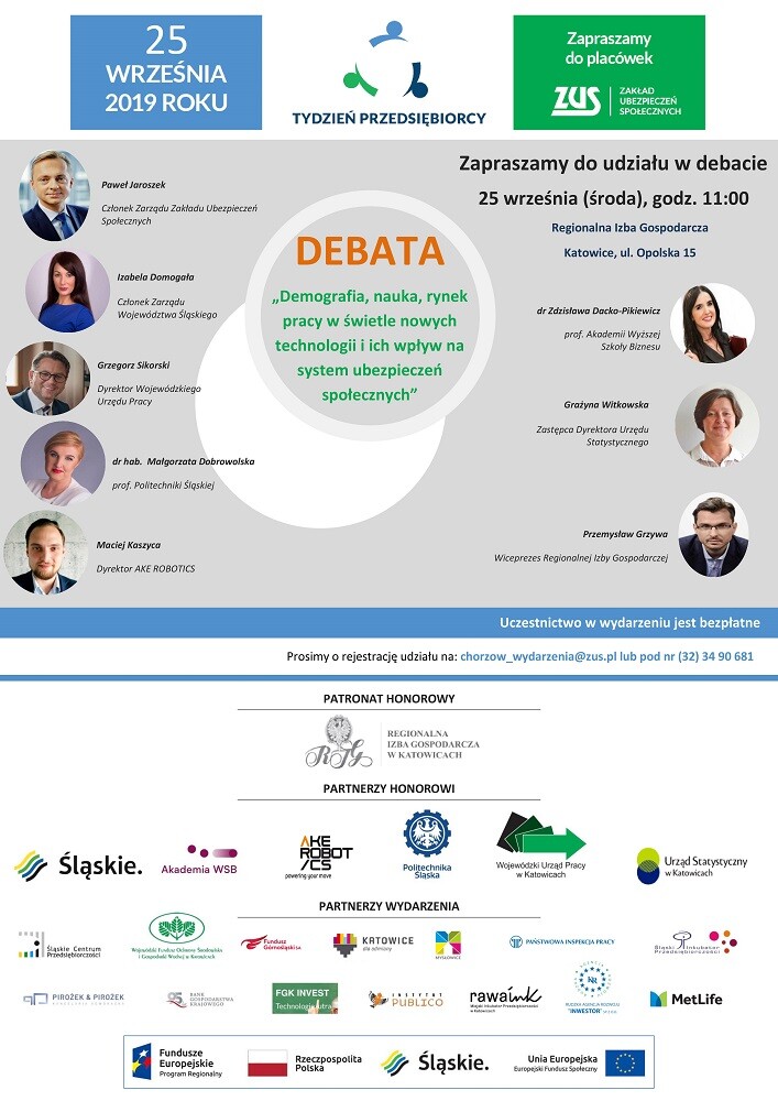 Zgłoszenia na debatę i szkolenia należy przyjmowane są pod numerem telefonu: 32 34 90 681 lub na adres: chorzow_wydarzenia@ zus.pl