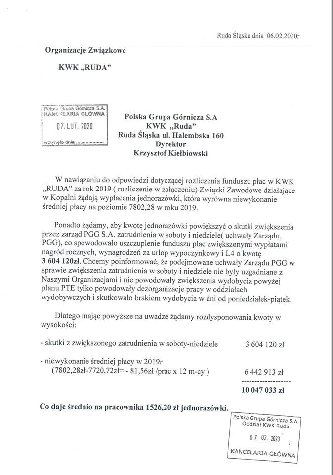 - W nawiązaniu do odpowiedzi dotyczącej rozliczenia funduszu płac w KWK Ruda za rok 2019 Związki Zawodowe działające w Kopalni żądają wypłacenia jednorazówki, która wyrówna niewykonanie średniej płacy na poziomie 7802,28 złotych w roku 2019 - czytamy w piśmie.