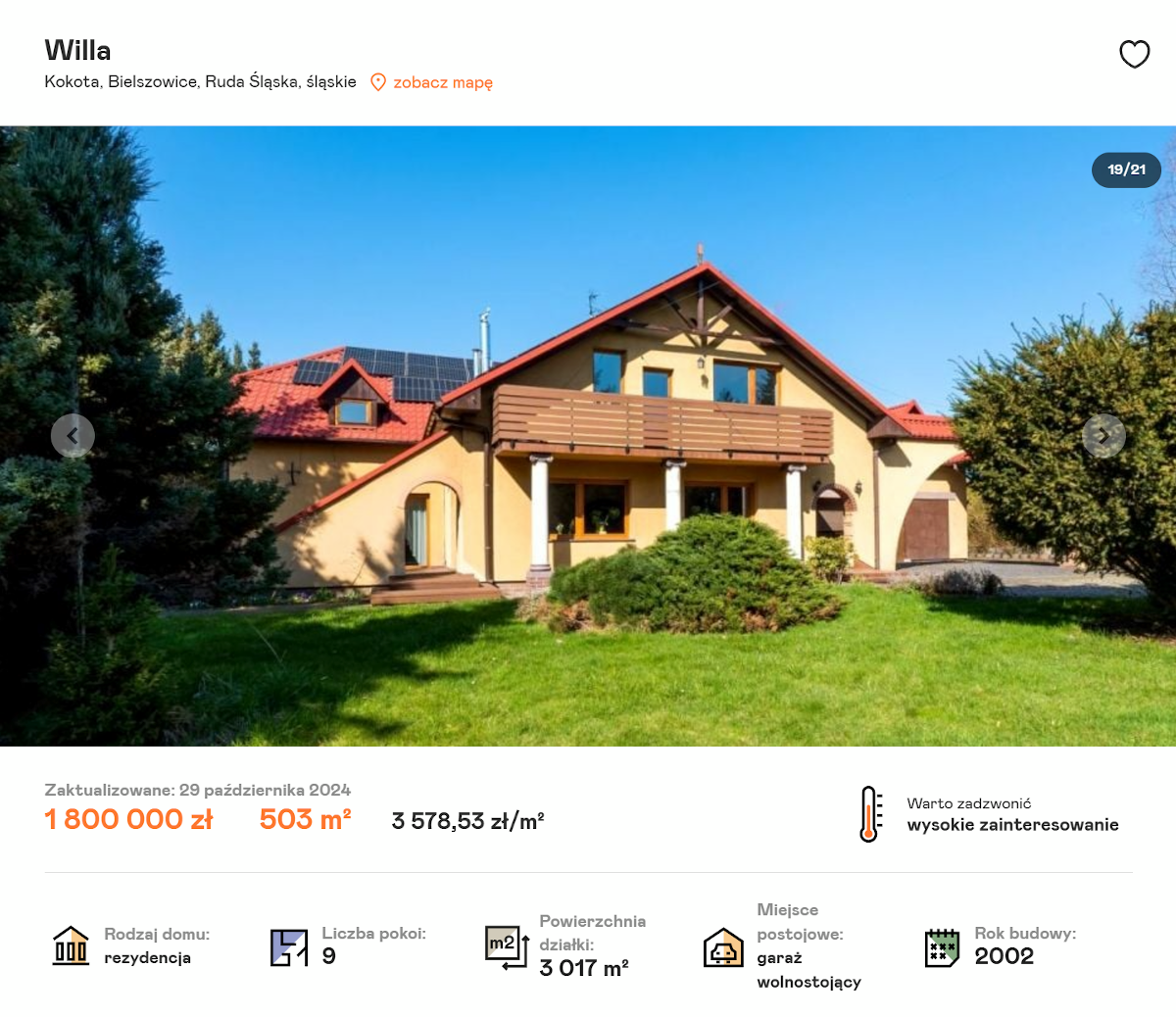 Za 1 800 000 złotych możemy w Rudzie Śląskiej nabyć rezydencję, która powstała w 2002 roku. Jej powierzchnia użytkowa to 440 metrów kwadratowych. Dom podzielony jest na 9 pokoi. Do dyspozycji nowych właścicieli pozostają też 3 łazienki. Nieruchomość sprzedawana jest wraz z działką, która obejmuje 3 017 metrów kwadratowych. Dom położony jest w zacisznej okolicy z dostępem do atrakcyjnych terenów zielonych. Jego lokalizacja pozwala na wygodny dojazd do każdej części miasta. Na posesji znajdziemy też garaż, który pomieści jeden samochód.