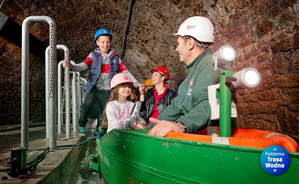 Podziemna trasa wodna to najnowsza i aktualnie najbardziej popularna atrakcja Sztolni, dostępna dla dzieciaków od 7 roku życia. Fragment górniczych, historycznych wyrobisk pokonuje się tu pieszo, a 1100 metrów to unikatowy, podziemny spływ łodziami. W jego trakcie, pod samym centrum 180-tysięcznego miasta, na odwiedzających czekają legendarne postaci, takie jak Skarbnik czy Utopek.