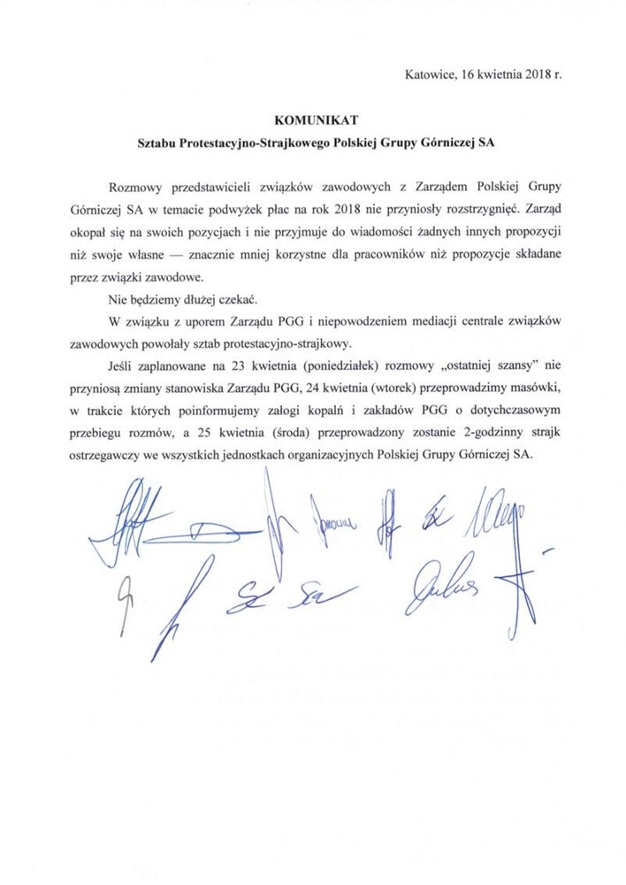 - Nie będziemy dłużej czekać. W związku z uporem Zarządu PGG i niepowodzeniem mediacji centrale związków zawodowych powołały sztab protestacyjno-strajkowych - możemy przeczytać w oświadczeniu. - Jeśli zaplanowane na 23 kwietnia rozmowy ”ostatniej szansy” nie przyniosą zmiany stanowiska Zarządu PGG, 24 kwietnia przeprowadzimy masówki, w trakcie których poinformujemy załogi kopalń i zakładów PGG o dotychczasowym przebiegu rozmów, a 25 kwietnia przeprowadzony zostanie 2-godzinny strajk ostrzegawczy we wszystkich jednostkach organizacyjnych Polskiej Grupy Górniczej SA.