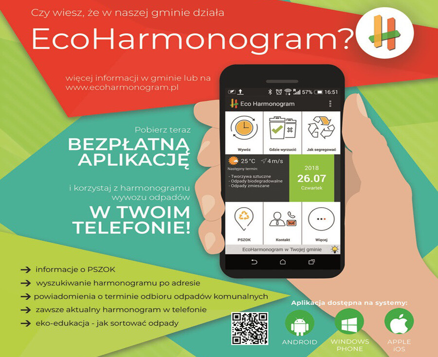 - Harmonogram: Za pomocą aplikacji mobilnej EcoHarmonogram mieszkańcy wyszukują swój harmonogram odbioru odpadów komunalnych za pomocą adresu. W ten sposób otrzymują tylko i wyłącznie harmonogram przypisany do danej posesji. Użytkownicy otrzymują też automatyczne powiadomienia o nadchodzących terminach wywozu odpadów komunalnych. Co ważne, użytkownik może skonfigurować sobie termin otrzymywania powiadomienia. Możliwe jest również ustawienie godziny przypomnienia (domyślnie jest to godzina 18:00). Ponadto każdy użytkownik aplikacji ma dostęp do specjalnego widoku, na którym znajdują się wszystkie frakcje odpadów wraz z najbliższym terminem wywozu dla danej frakcji. Mieszkańcy mają też wgląd do wszystkich terminów odbioru odpadów z podziałem na miesiące. Aplikacja przypomina również o terminach płatności.
