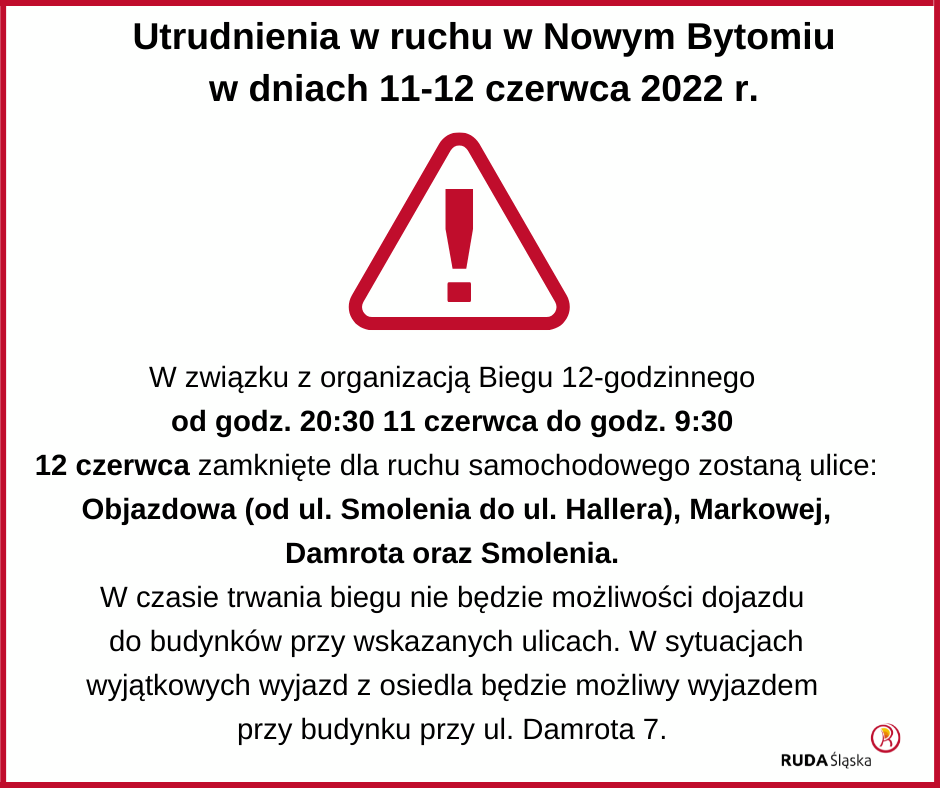 W czasie trwania biegu nie będzie możliwości dojazdu do budynków przy wskazanych ulicach. W sytuacjach wyjątkowych wyjazd z osiedla będzie możliwy wyjazdem przy budynku przy ul. Damrota 7.