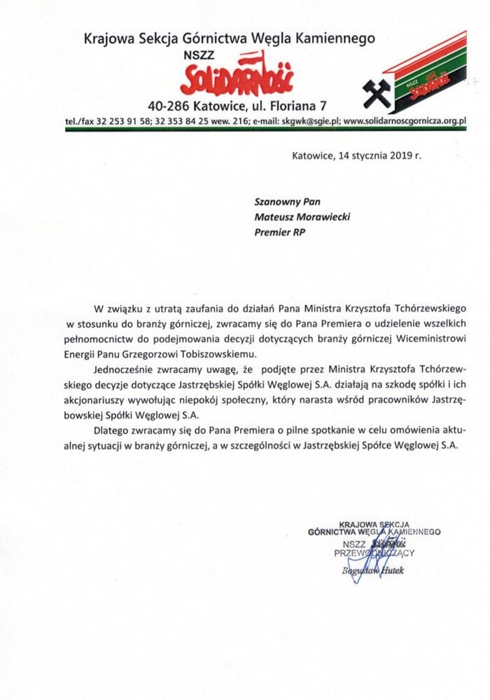 Kilka dni temu Górnicza Solidarność w specjalnym liście do Prezesa Rady Ministrów zwróciła się także o udzielenie wszelkich pełnomocnictw dotyczących górnictwa wiceministrowi Grzegorzowi Tobiszowskiemu. Związkowcy podkreślają, że stracili zaufanie do ministra Krzysztofa Tchórzewskiego.