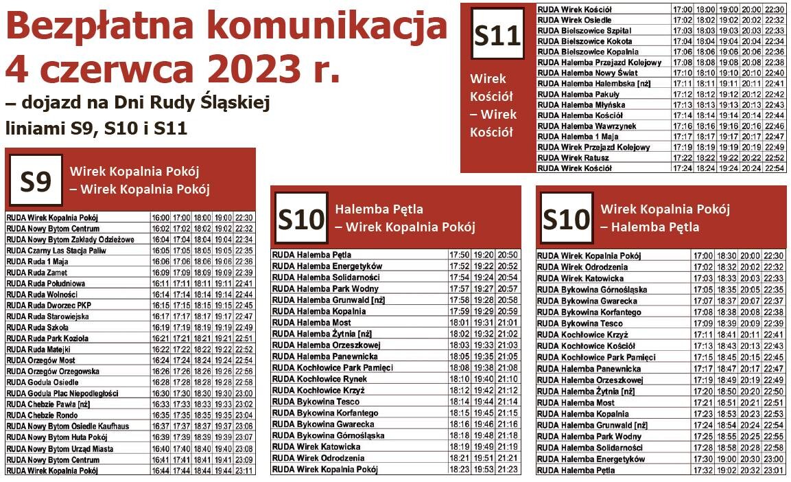 Bezpłatny transport zbiorowy podczas drugiego dnia święta miasta Ruda Śląska, który odbędzie się 4 czerwca 2023 r., będzie zapewniony przez trzy linie autobusowe: S9, S10 i S11.